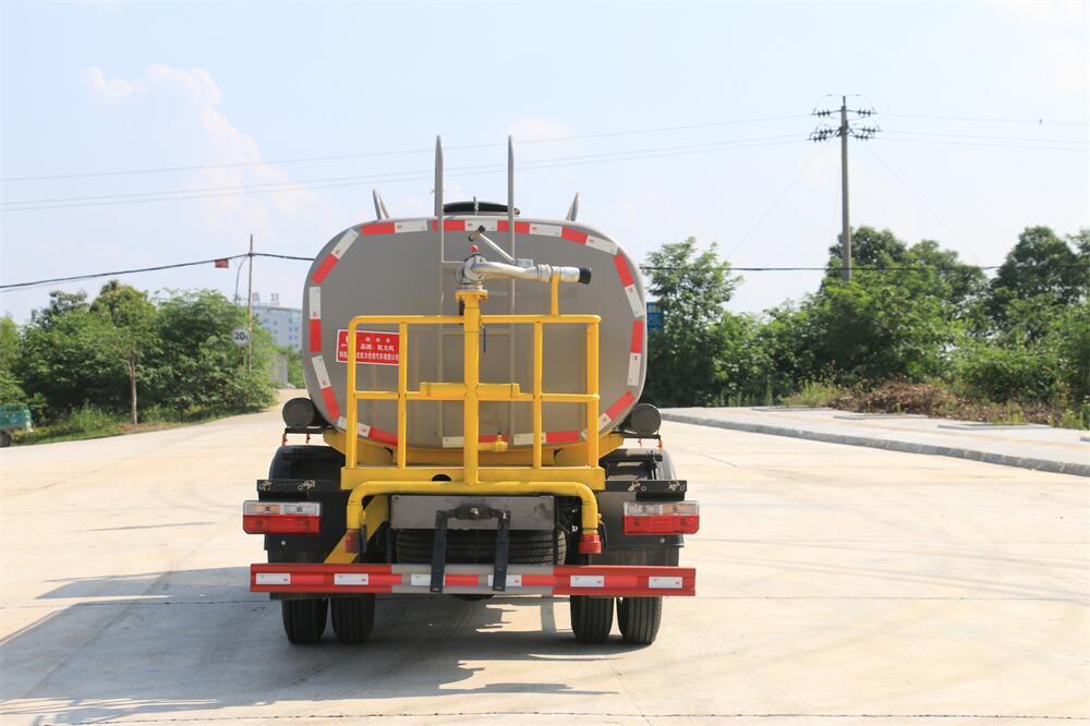 灑水車(chē)前裝有鴨形噴嘴或圓頭沖嘴,后面裝有圓柱開(kāi)灑水噴嘴或蓮蓬頭噴嘴,后部有一工作平臺(tái),裝配有水炮。后部還可裝8個(gè)噴嘴(選裝)。