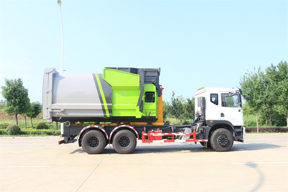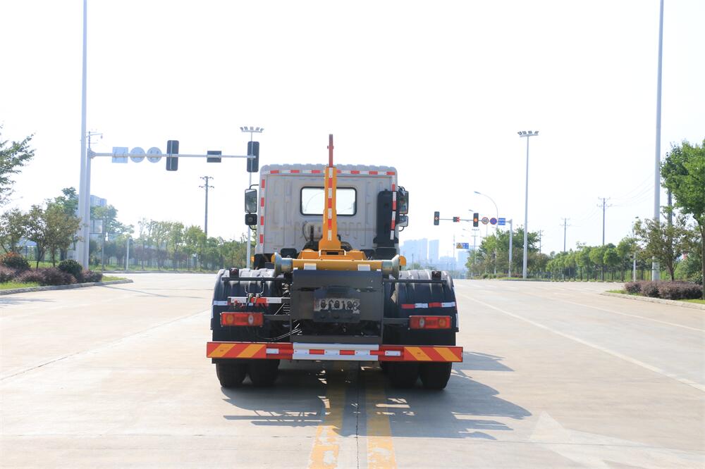 勾臂式垃圾車(車廂可卸式垃圾車)介紹: 車廂可卸式垃圾車又叫拉臂式垃圾車,是一種采用高新設(shè)計(jì)可伸縮的鉤臂,實(shí)現(xiàn)垃圾廂的二次吊裝,自吊上放下,可自行傾倒垃圾的環(huán)衛(wèi)設(shè)備。 拉臂式垃圾車結(jié)構(gòu)簡單,操作穩(wěn)定方便,裝卸效率高,機(jī)械化程度高,節(jié)省人力。鉤臂垃圾車一車可帶多個(gè)垃圾廂,在裝卸的運(yùn)輸過程中可有效地避免二次污染。 拉臂垃圾車采用高新設(shè)計(jì)可擺動(dòng)的鉤臂,垃圾箱由框架、開啟油缸、滑輪、后門和若干加強(qiáng)框架與鋼板焊接而成。調(diào)換貨廂快捷方便,貨廂上帶蓋(倒垃圾時(shí)可翻開),鉤臂垃圾車?yán)鴰w可選用碳鋼、不銹鋼材質(zhì)、內(nèi)部采取環(huán)氧樹脂防腐處理,改裝部分與原車底盤為可分離式,維修方便且保持了原車的機(jī)動(dòng)性及行駛性能。