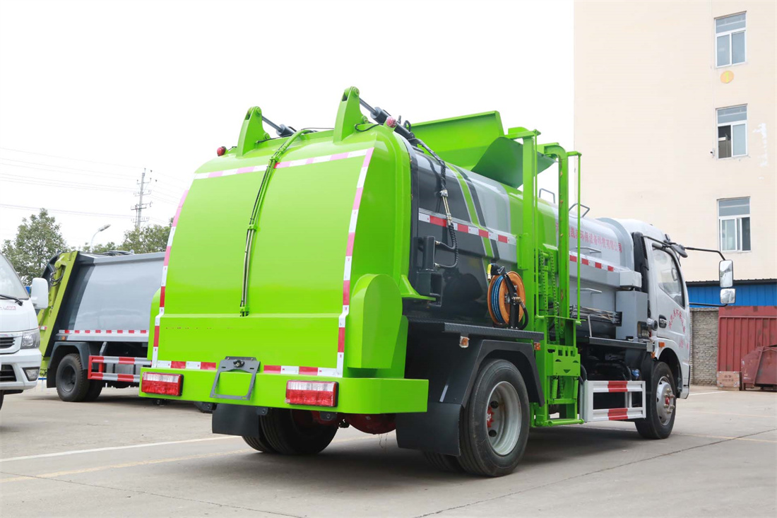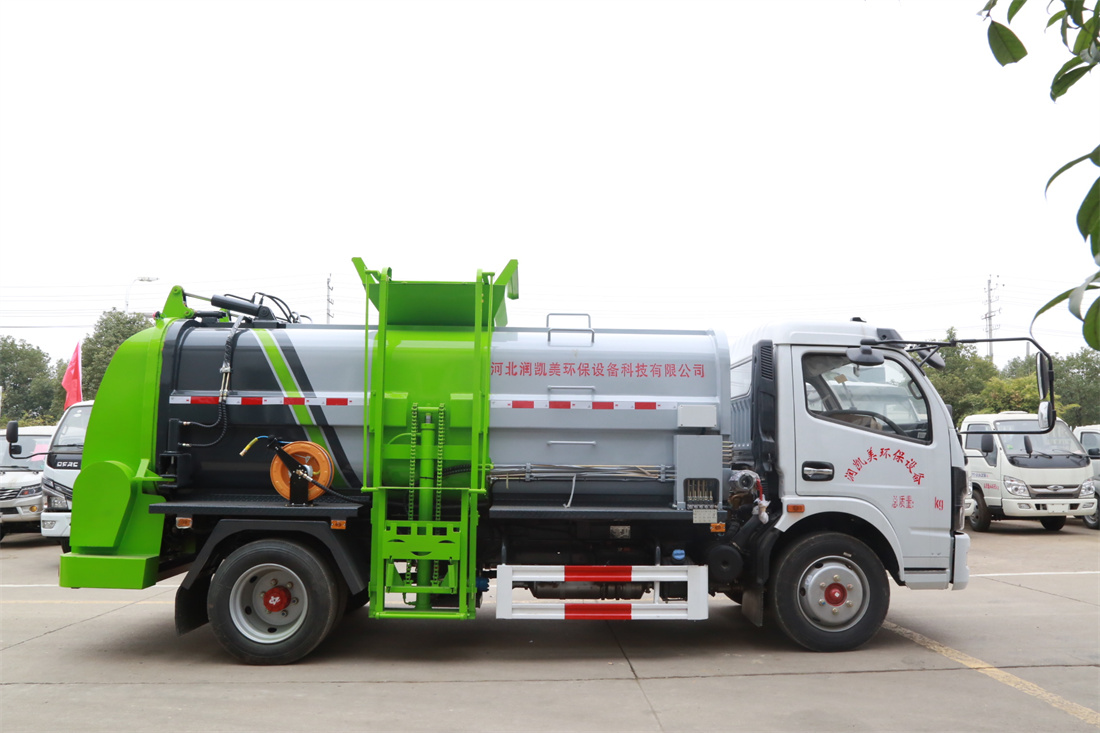 上裝配置:罐體容積8m3,配備120L/240L掛桶提升翻轉機構,液壓系統,后蓋液壓鎖緊開啟,罐體可以舉升自卸,尾部帶自流閥;用于運輸液態垃圾,其特點操作簡單,密封性好,無泄漏,無異味;可選裝固液分離功能,推板擠壓功能,常用于餐館的垃圾轉運處理。