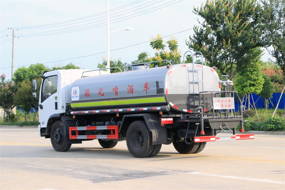 灑水車前裝有鴨形噴嘴或圓頭沖嘴,后面裝有圓柱開灑水噴嘴或蓮蓬頭噴嘴,后部有一工作平臺(tái),裝配有水炮。后部還可裝8個(gè)噴嘴(選裝)。
