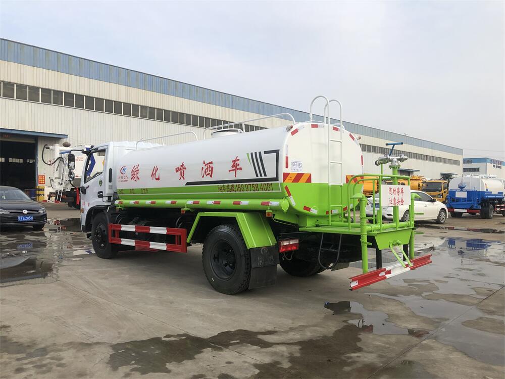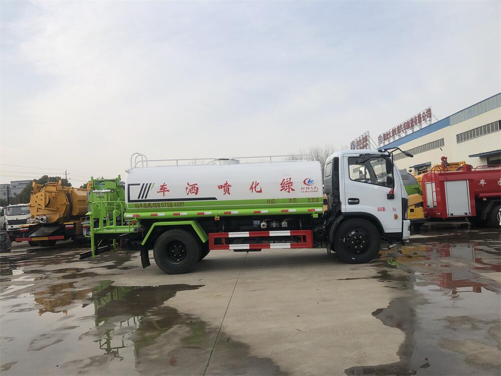 灑水車前裝有鴨形噴嘴或圓頭沖嘴,后面裝有圓柱開(kāi)灑水噴嘴或蓮蓬頭噴嘴,后部有一工作平臺(tái),裝配有水炮。后部還可裝8個(gè)噴嘴(選裝)。
