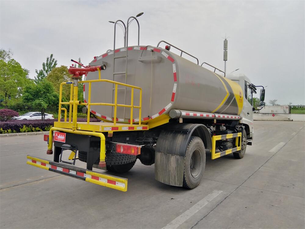 灑水車前裝有鴨形噴嘴或圓頭沖嘴,后面裝有圓柱開灑水噴嘴或蓮蓬頭噴嘴,后部有一工作平臺(tái),裝配有水炮。后部還可裝8個(gè)噴嘴(選裝)。