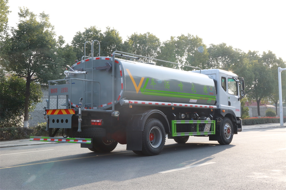 灑水車前裝有鴨形噴嘴或圓頭沖嘴,后面裝有圓柱開灑水噴嘴或蓮蓬頭噴嘴,后部有一工作平臺,裝配有水炮。后部還可裝8個噴嘴(選裝)。