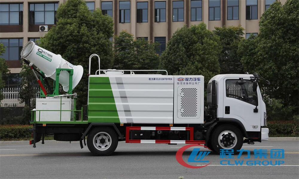上裝配置:罐體容積為 8立方,選配風送式霧炮機組射程30米、40米、50米、60米、80米、100米、120米霧炮,罐體鋼板為4mm碳鋼Q235材質(zhì),罐內(nèi)隔板具有防波作用,以減輕汽車行駛時罐體液體沖擊,罐體及整車外形尺寸按照公告。帶大功率專用灑水泵,泵可自吸自排,整車前沖、后灑、側(cè)噴、帶65消防接口,后平臺配CLW-50、CLW-60、CLW-80、CLW-100、CLW-120型風送式霧炮機組;罐體前封頭配大功率柴油發(fā)電機組;前封頭帶水位計,后平臺主管路帶1寸澆花接口,后爬梯。帶兩根輸水管及陰陽端。罐體顏色:銀/灰/綠,罐體兩側(cè)噴“多功能抑塵車”字樣,貼反光標示。