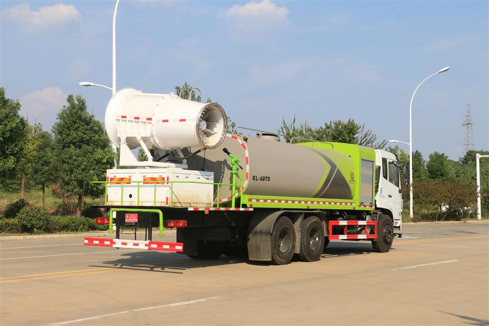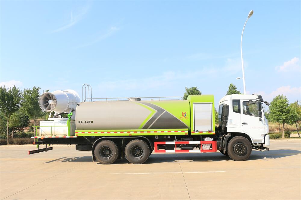 上裝配置:罐體容積為 16立方,選配風(fēng)送式霧炮機組射程30米、40米、50米、60米、80米、100米、120米霧炮,罐體鋼板為4mm碳鋼Q235材質(zhì),罐內(nèi)隔板具有防波作用,以減輕汽車行駛時罐體液體沖擊,罐體及整車外形尺寸按照公告。帶大功率專用灑水泵,泵可自吸自排,整車前沖、后灑、側(cè)噴、帶65消防接口,后平臺配CLW-50、CLW-60、CLW-80、CLW-100、CLW-120型風(fēng)送式霧炮機組;罐體前封頭配大功率柴油發(fā)電機組;前封頭帶水位計,后平臺主管路帶1寸澆花接口,后爬梯。帶兩根輸水管及陰陽端。罐體顏色:銀/灰/綠,罐體兩側(cè)噴“多功能抑塵車”字樣,貼反光標示。